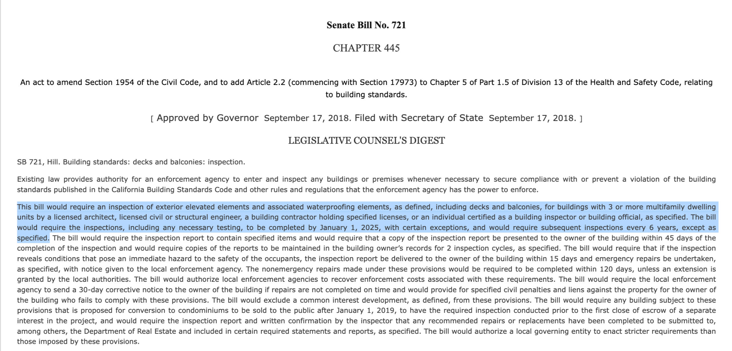 "This bill would require an inspection of exterior elevated elements and associated waterproofing elements, as defined, including decks and balconies, for buildings with 3 or more multifamily dwelling units by a licensed architect, licensed civil or structural engineer, a building contractor holding specified licenses, or an individual certified as a building inspector or building official, as specified.The bill would require the inspections, including any necessary testing, to be completed by January 1, 2026, with certain exceptions, and would require subsequent inspections every 6 years, except as specified..."